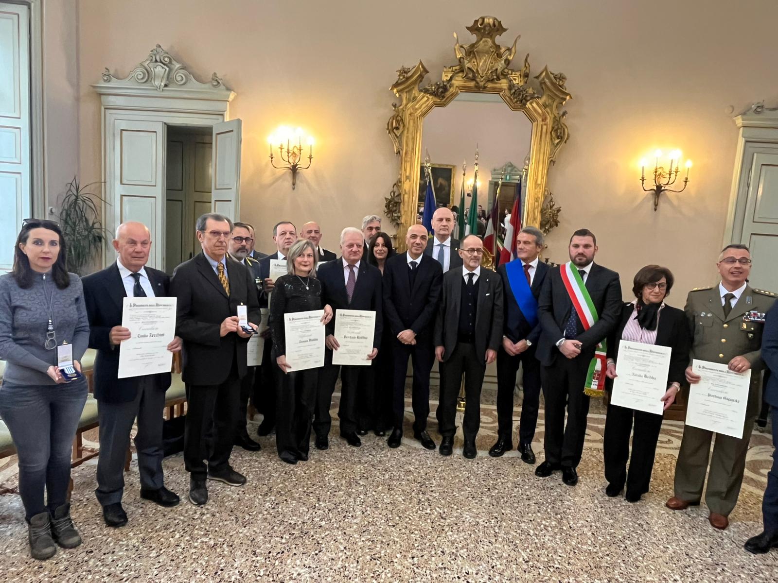 Con Natalia Bobba, di Vinzaglio, (che ha guidato Donne & Riso dal 2014 al 2024) hanno ricevuto l’onorificenza di Cavaliere della Repubblica anche il luogotenente Luigi Bessone, comandante della stazione carabinieri di Gattico-Veruno (NO), Marco Caviggioli di Bellinzago Novarese, l’appuntato scelto dei carabinieri Giovanni Resta di Novara, Emilio Zecchini di Caltignaga (NO), Renato Morea di Pettenasco (NO), Roberto Cimberio di Pettenasco (NO), ten. col. Pierluigi Gigante di Novara, col. Antonio Valentino, comandante provinciale della Guardia di Finanza di Novara, Carlo Ruffino di Novara, Tamara Violini di Novara. Due medaglie d’onore sono state consegnate dal prefetto in memoria di Attalo Bergamini di Trecate e Adriano Carpani di Novara, deportati e internati nei lager nazisti. In apertura, dopo i saluti iniziali, è intervenuto Paolo Cattaneo, presidente dell’Istituto Storico della Resistenza di Novara e Verbano Cusio Ossola, per sottolineare il significato di una cerimonia che – insieme con il prefetto Garsia – ha inteso gettare un ponte tra passato e future generazioni, ricordando l’opera del Presidente della Repubblica Oscar Luigi Scalfaro, novarese, nella sua lunga attività di politico, durante e dopo il settennato al Quirinale, nei confronti dei giovani. E a questo proposito ad alcuni studenti delle scuole superiori e universitari è stata donata una  copia del volume “Credere nei valori”, contenente discorsi sulla Costituzione e sull’Italia pronunciati da Scalfaro.